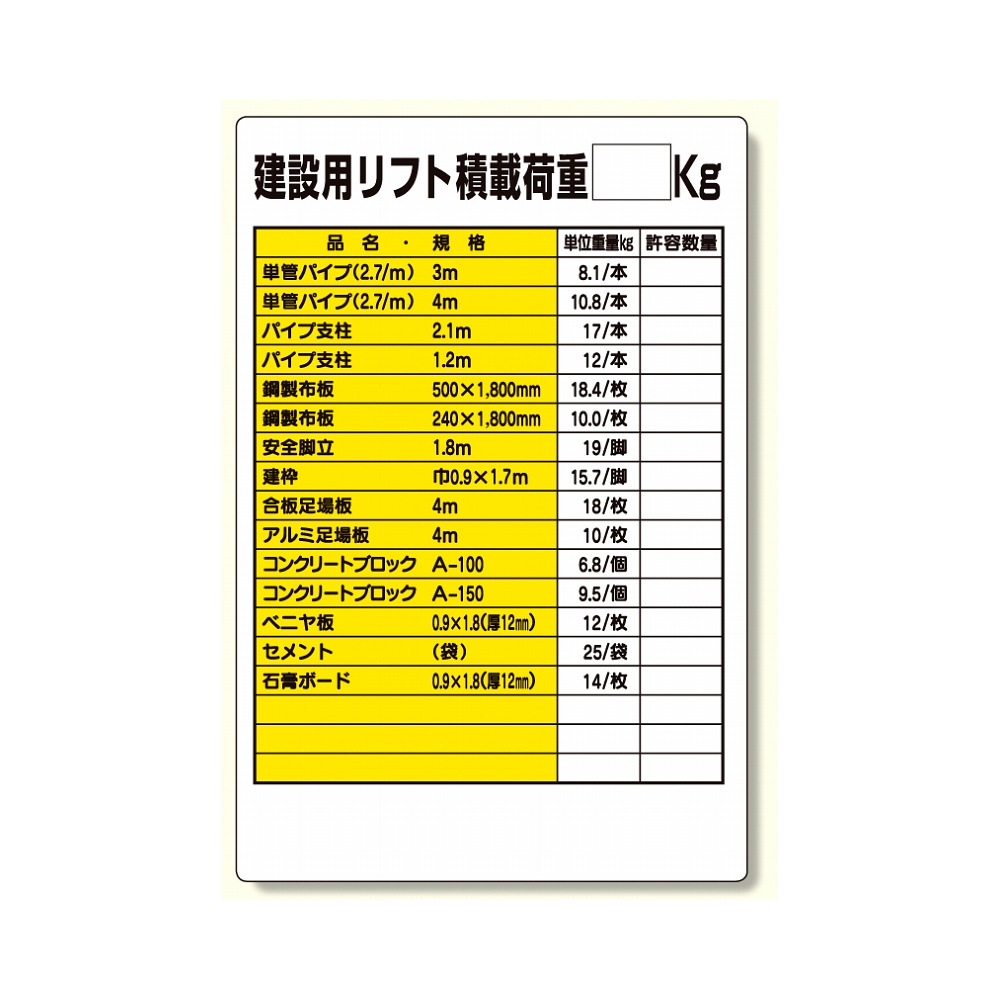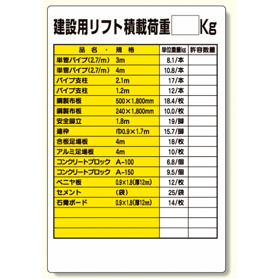 - リフト関係標識 建設用リフト積載荷重