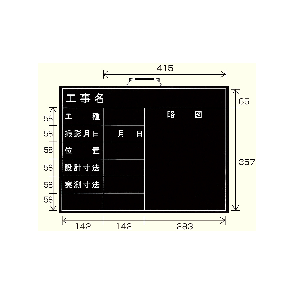 商品説明:撮影用黒板 工事名/工種/撮影月日/位置/設計寸法/実測寸法/略図 (横型) (373-05)
