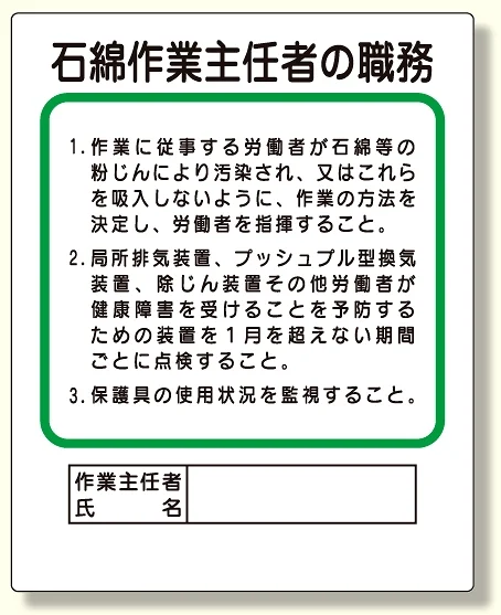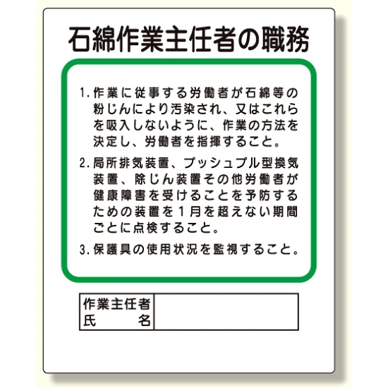 作業主任者職務板 石綿作業主任者の職務 (356-37A) の商品詳細