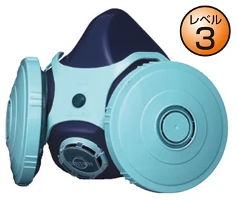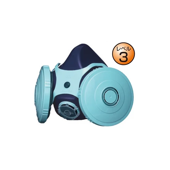 国家検定合格第TM207号 特長:マイティミクロンフィルター使用のダブルタイプ。 下方視野に優れます。 肌に優しいシリコーン面体。 廃じんの度合い:高 ① 中 ② 低 ③ ■レベル:3 その他の石綿含有建材(成形板等)の除去作業 発じん性が比較的低い作業で、破砕、切断等の作業においては発じんを伴うため、湿式作業を原則とし、発じんレベルに応じた防じんマスクを必要とするレベル