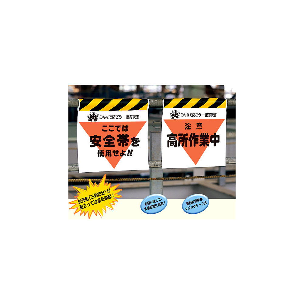 蛍光色(三角部分)が 目立って注意を喚起! 手軽に使えて大量設置に最適! 着脱が簡単なマジックテープ式