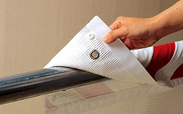 - 取付けが簡単なホック式。さらに上部2ヵ所、下部3ヵ所のハトメで、別売のナイロンバンド(自動ロック式)やバン線を使って単管にしっかり設置でき、強風でホックがはずれたときも安心です。