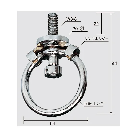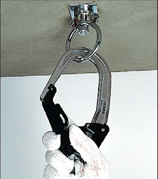 - ●設置は天井に。シッカリ固定できます。 天井コンクリート面に埋め込んだインサート金具に、回転リングをねじ込み、リングに安全帯のフックを掛けて使用します。※十分な強度(1150kgf以上)を有する天井のみに設置します。 垂直方向の壁面には設置できません。