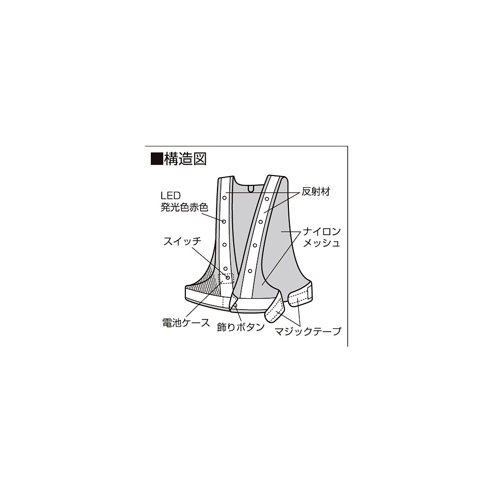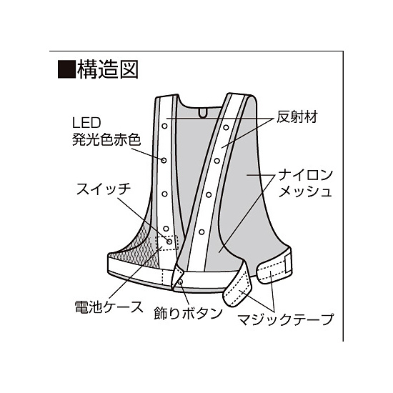 - カラー:生地/紺 反射部/白LED:カラー/赤色発光(正面8個、背面8個)