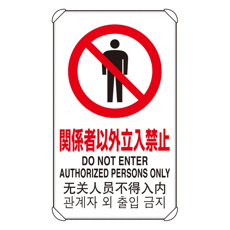 - 関係者以外の進入を制限したい場所に、分かりやすく設置しやすい四カ国語対応の安全標識です。