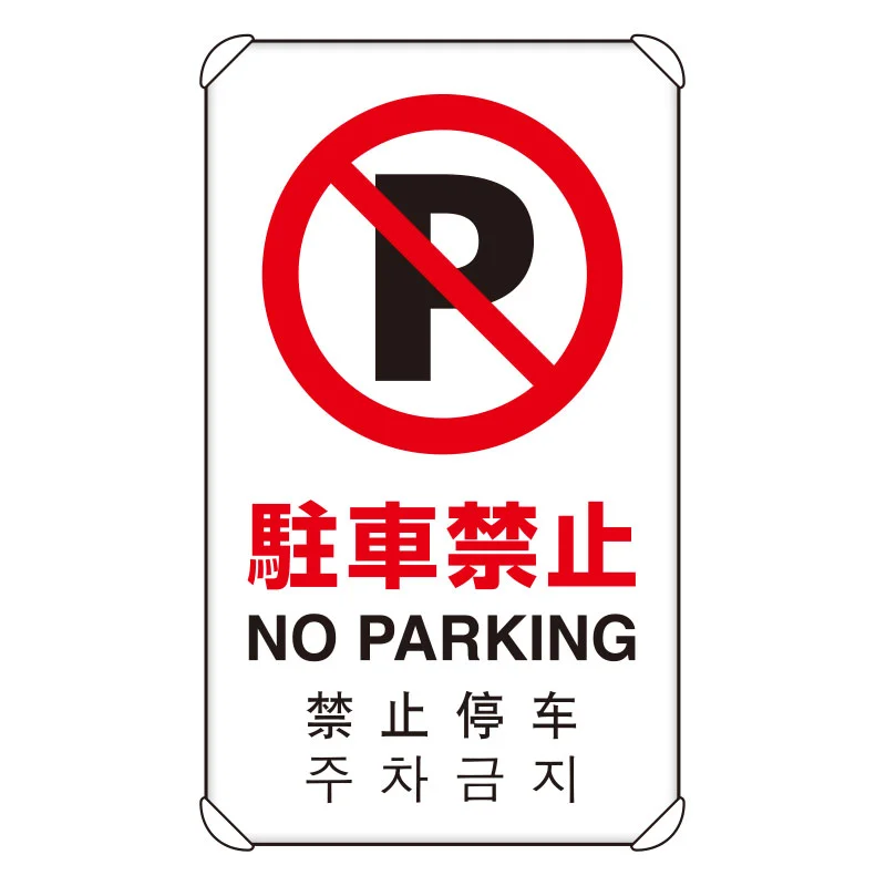 - 禁止マークと車のピクトグラムで直感的に認識しやすく、日本語・英語・中国語・韓国語で案内できるため、出入口まわりや通路付近、敷地内の駐車制限表示として役立ちます。