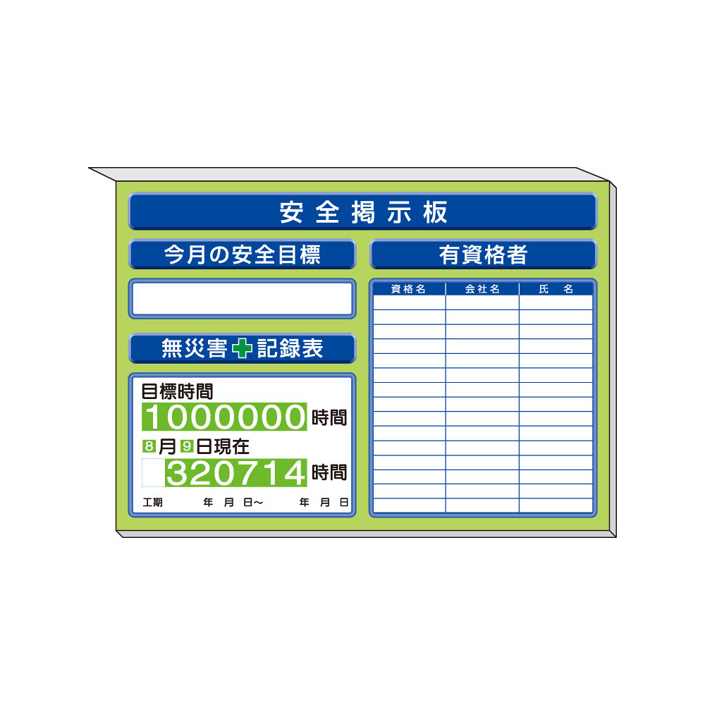 商品説明:スーパーフラットミニ掲示板 有資格者一覧表他入 カラー:緑地 (313-87AG)