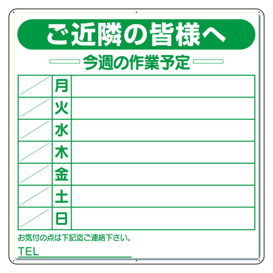 商品説明:作業予定看板セット ご近隣の皆様へ 900mm角 水性ペン・消具付 (301-11)