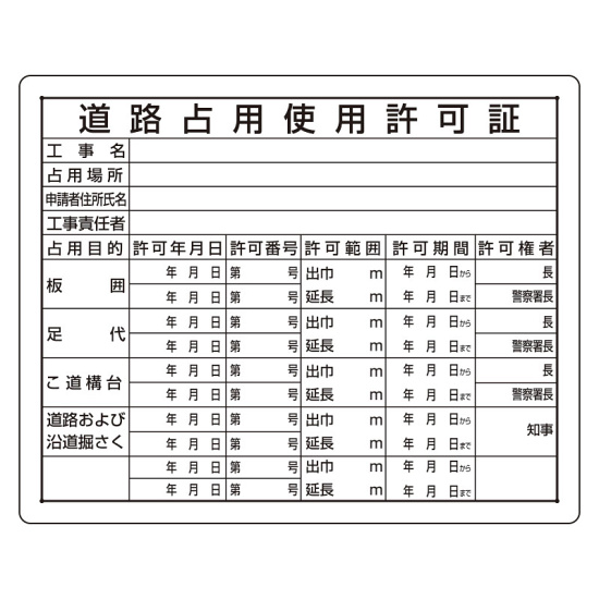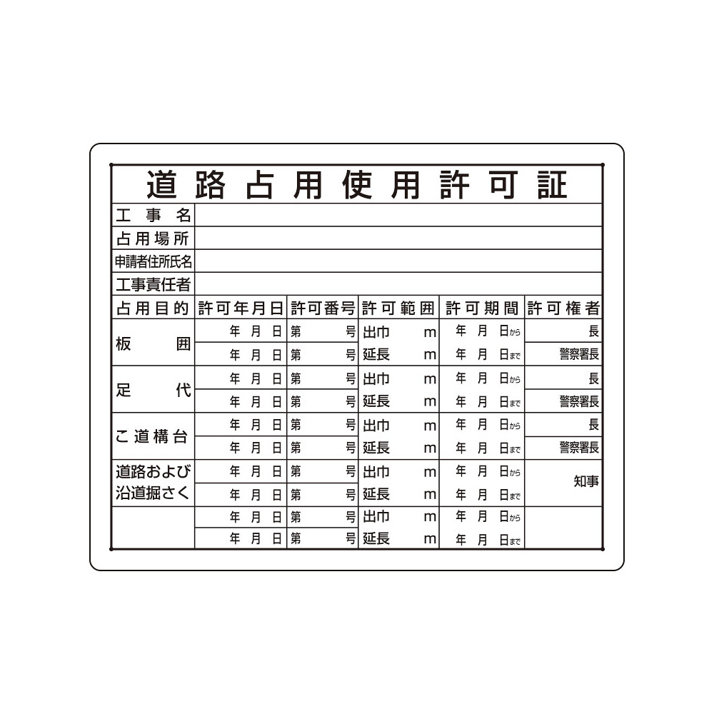 商品説明:法令許可票 道路占用使用許可証 材質:エコユニボード (302-09A)