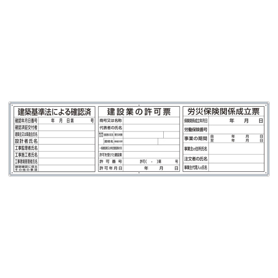 - 表示内容:建築基準法による確認済/建設業の許可票/労災保険関係成立票