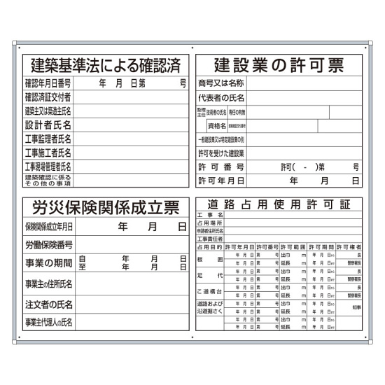 - 表示内容:建築基準法による確認済/建設業の許可票/労災保険関係成立票/道路占用使用許可証
