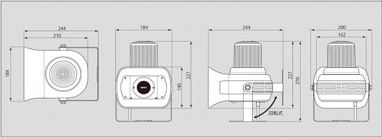 - 電子音声警報器とLED回転灯との一体化により、建設作業所・道路等における事故防止と災害防止に効果を発揮します。