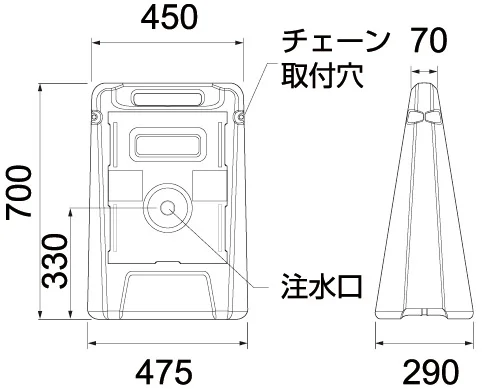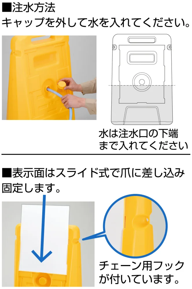 - 本体注水式で安定して設置しやすく、表示板は別売のため、現場に合わせた案内表示づくりに役立ちます。