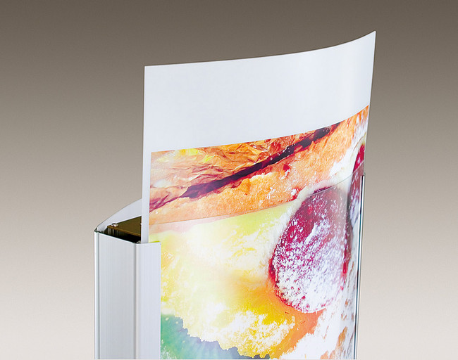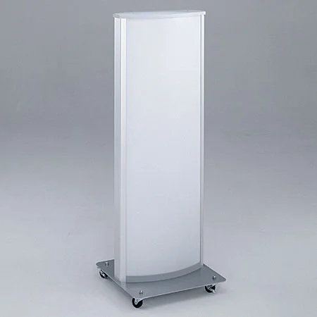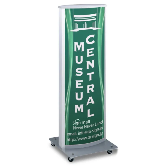 透明板と乳半板の間に表示シートを挟み込む内照式スタンド看板。曲面が美しいデザイン。