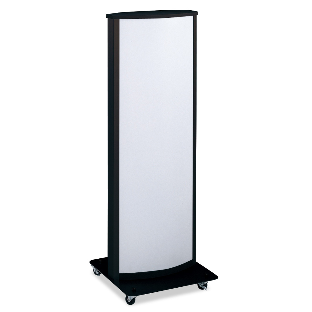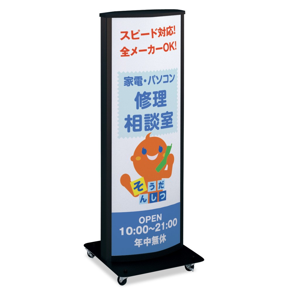 透明板と乳半板の間に表示シートを挟み込む内照式スタンド看板。曲面が美しいデザイン。