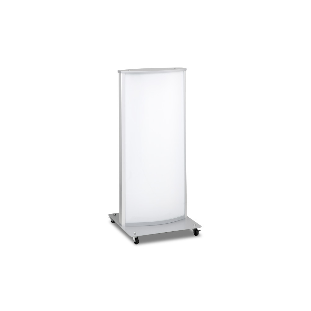 透明板と乳半板の間に表示シートを挟み込む内照式スタンド看板。曲面が美しいデザイン。