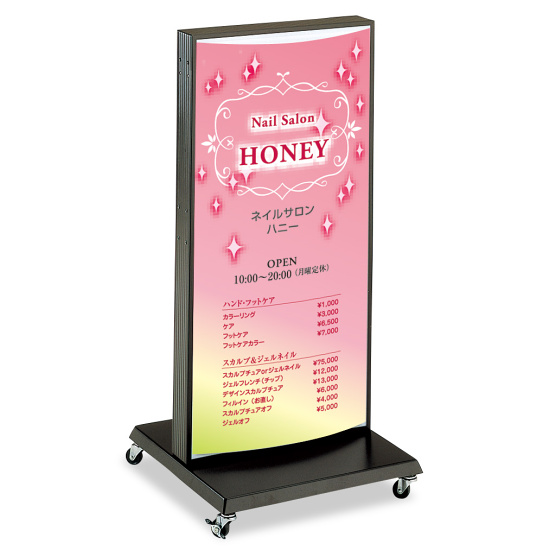 - 印刷シートを板面に貼り込むタイプのサインスタンド。糊付きの電飾フィルム(コルトンフィルム・バックライトフィルム)を直接背板に貼り込みます。