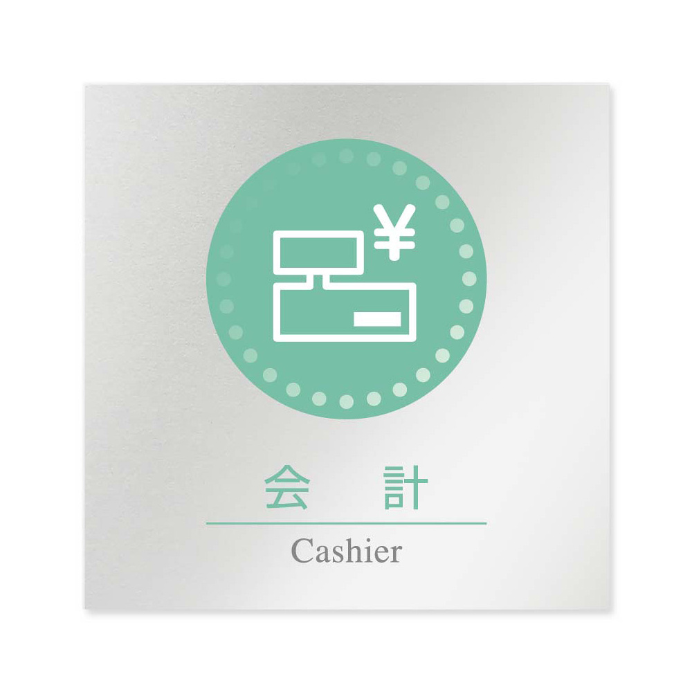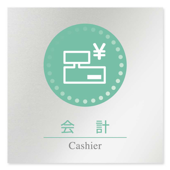 商品説明:デザイナールームプレート 丸ピクト 会計 アルミ板 W150×H150 (AL-1515-HB-HN1-0116)