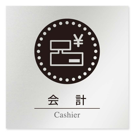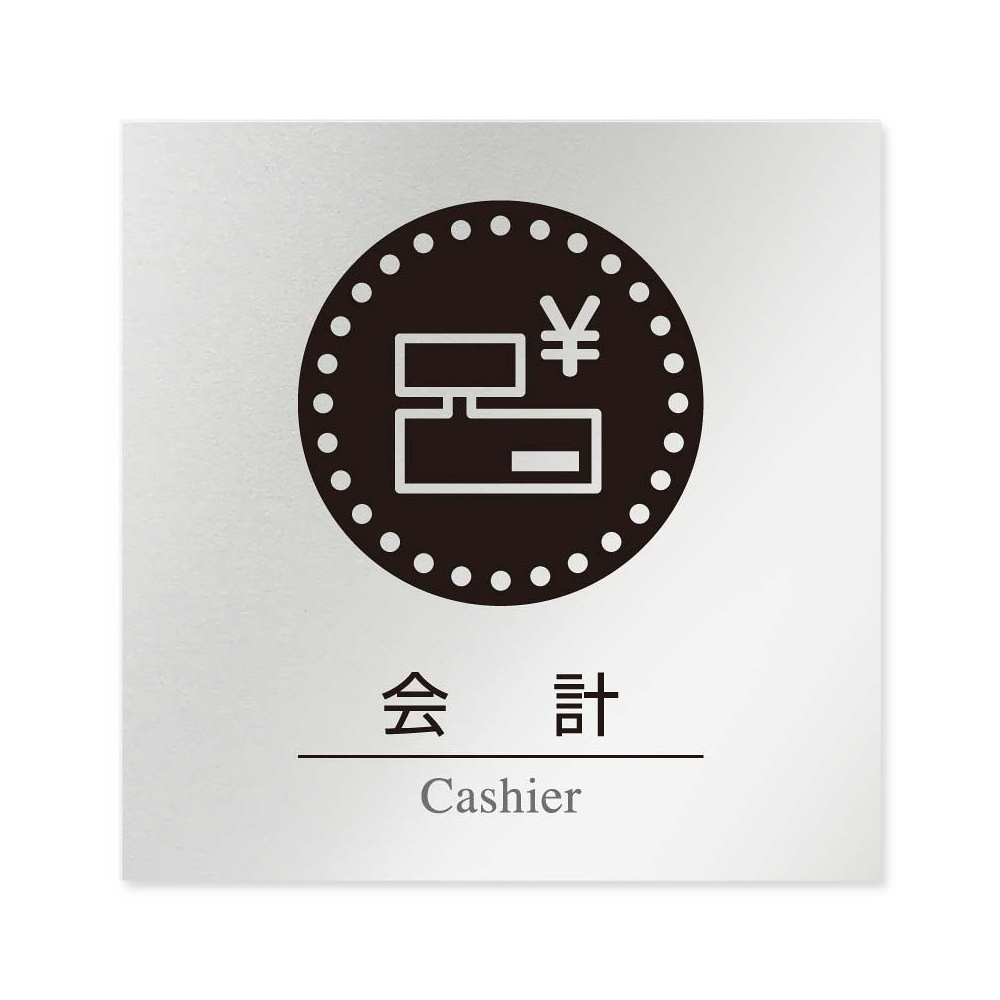 商品説明:デザイナールームプレート 丸ピクト 会計 アルミ板 W150×H150 (AL-1515-HB-HN2-0116)