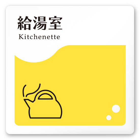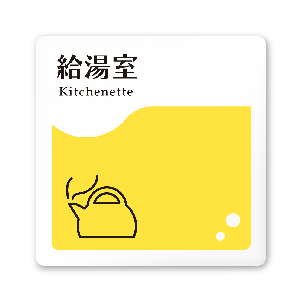 商品説明:デザイナールームプレート 飲食店向け イエロー 給湯室 白マットアクリル W150×H150 (AC-1515-RA-HS2-0117)