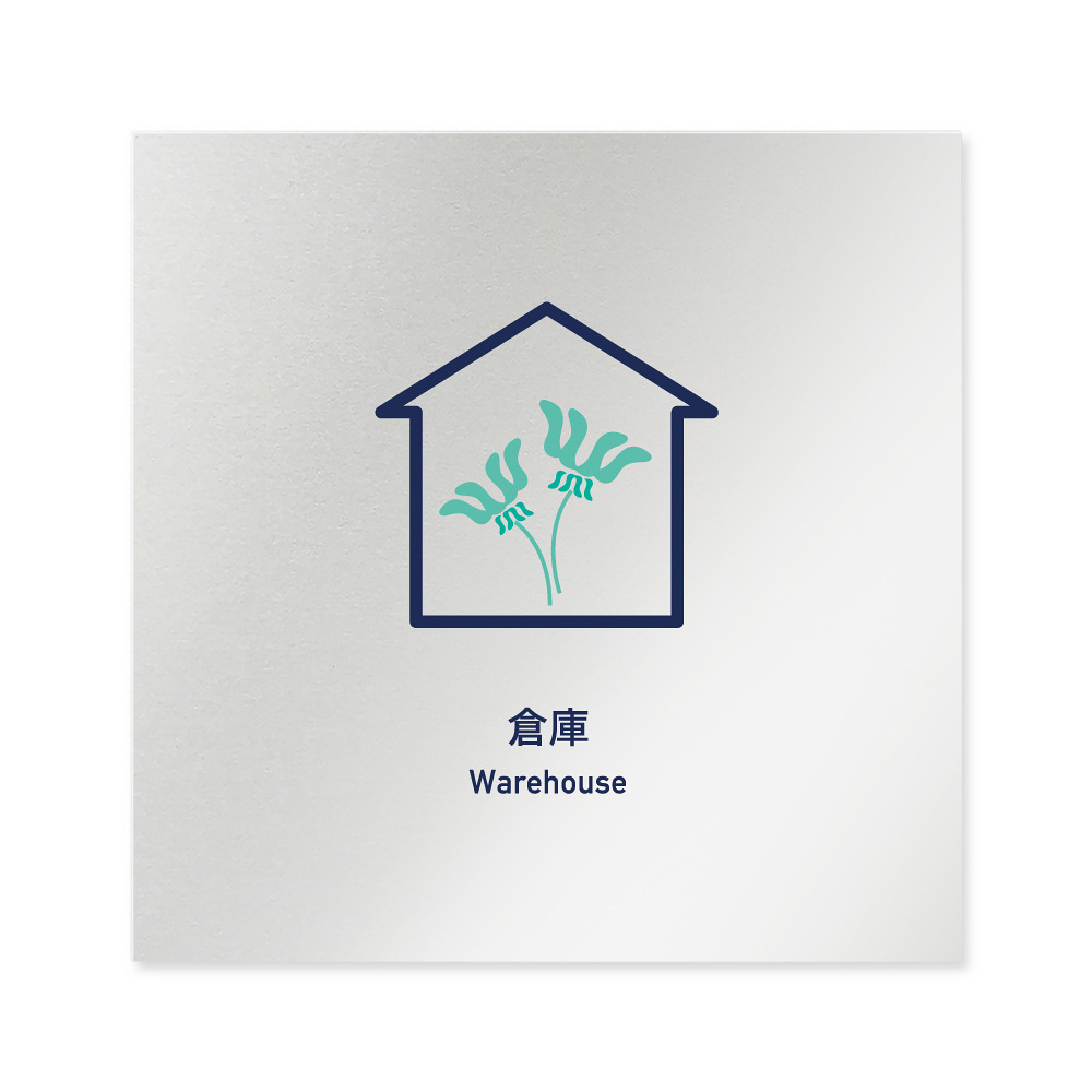 商品説明:デザイナールームプレート アパレル向け ボタニカル 倉庫 アルミ板 W150×H150 (AL-1515-AB-IM3-0115)