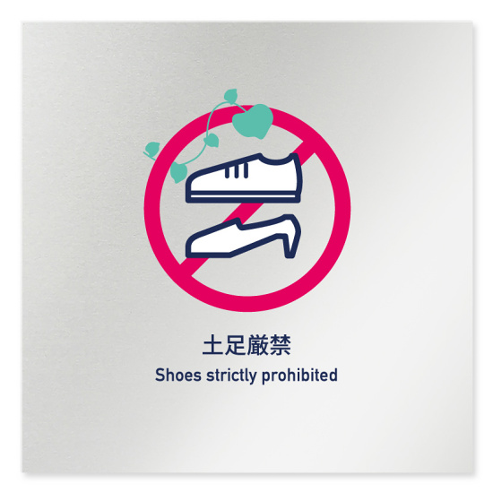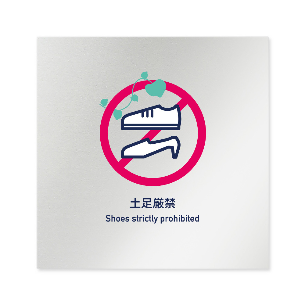 商品説明:デザイナールームプレート アパレル向け ボタニカル 土足厳禁 アルミ板 W150×H150 (AL-1515-AB-IM3-0118)