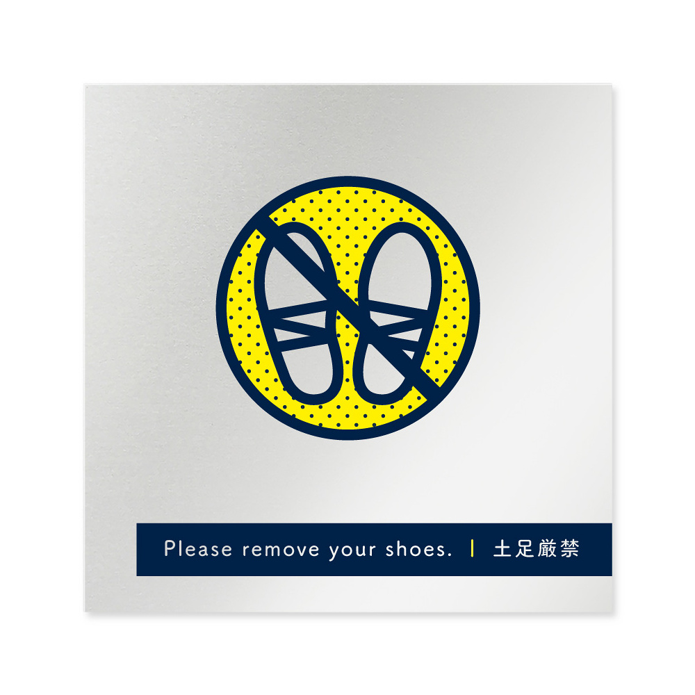 商品説明:デザイナールームプレート アパレル向け ドット 土足厳禁 アルミ板 W150×H150 (AL-1515-AB-NT2-0118)