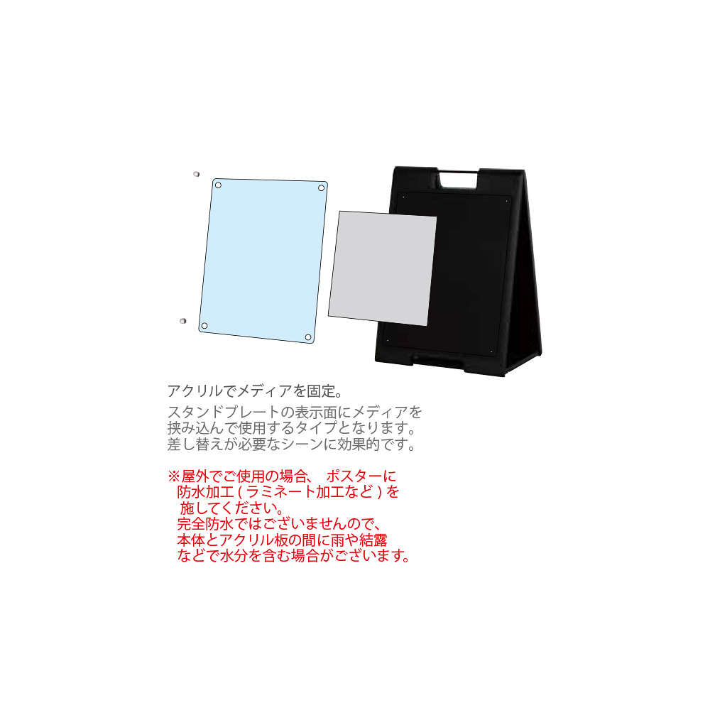 スタンドプレートの表示面にメディアを挟み込んで使用するタイプとなります。差し替えが必要なシーンに効果的です。