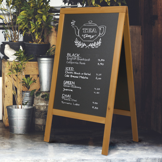 カフェ・レストラン大国ヨーロッパで生まれたA型ボード。本場で培われた存在感のあるデザインは、人々の目を奪います。マーカー・チョークが使用可能。表面はひっかき傷に強い塗装を施しています。開き止にチェーンが付属しています。