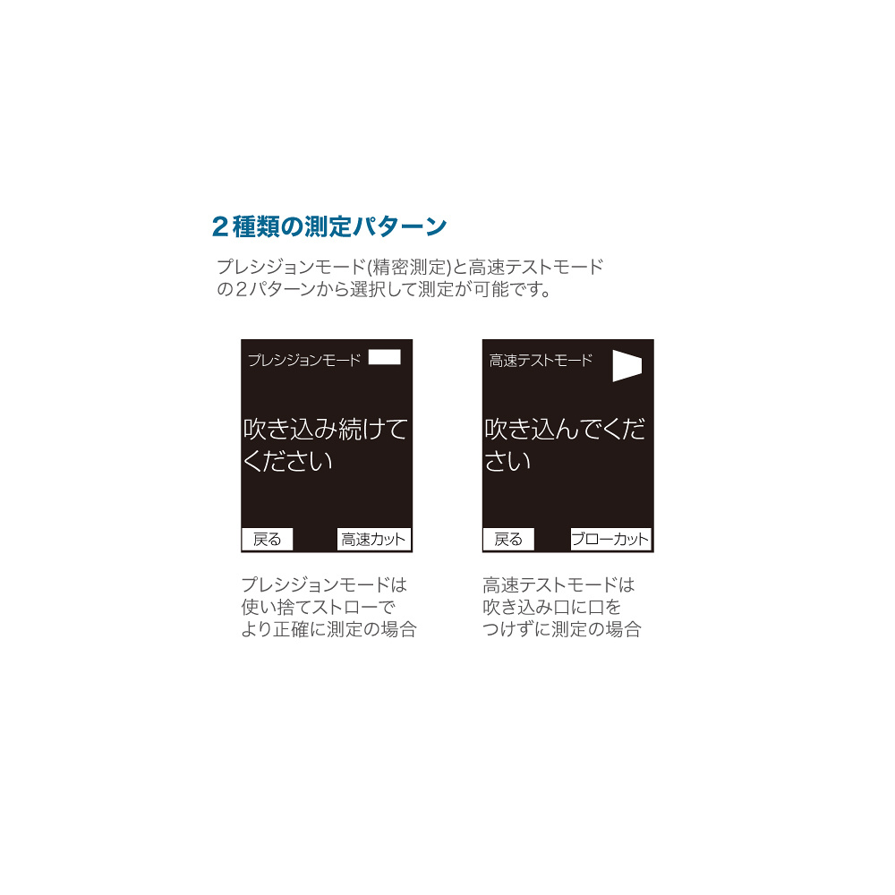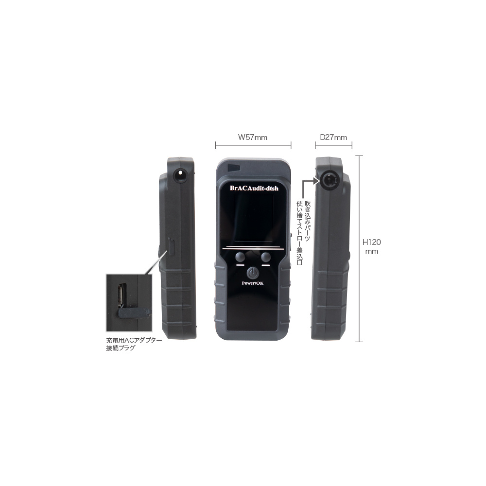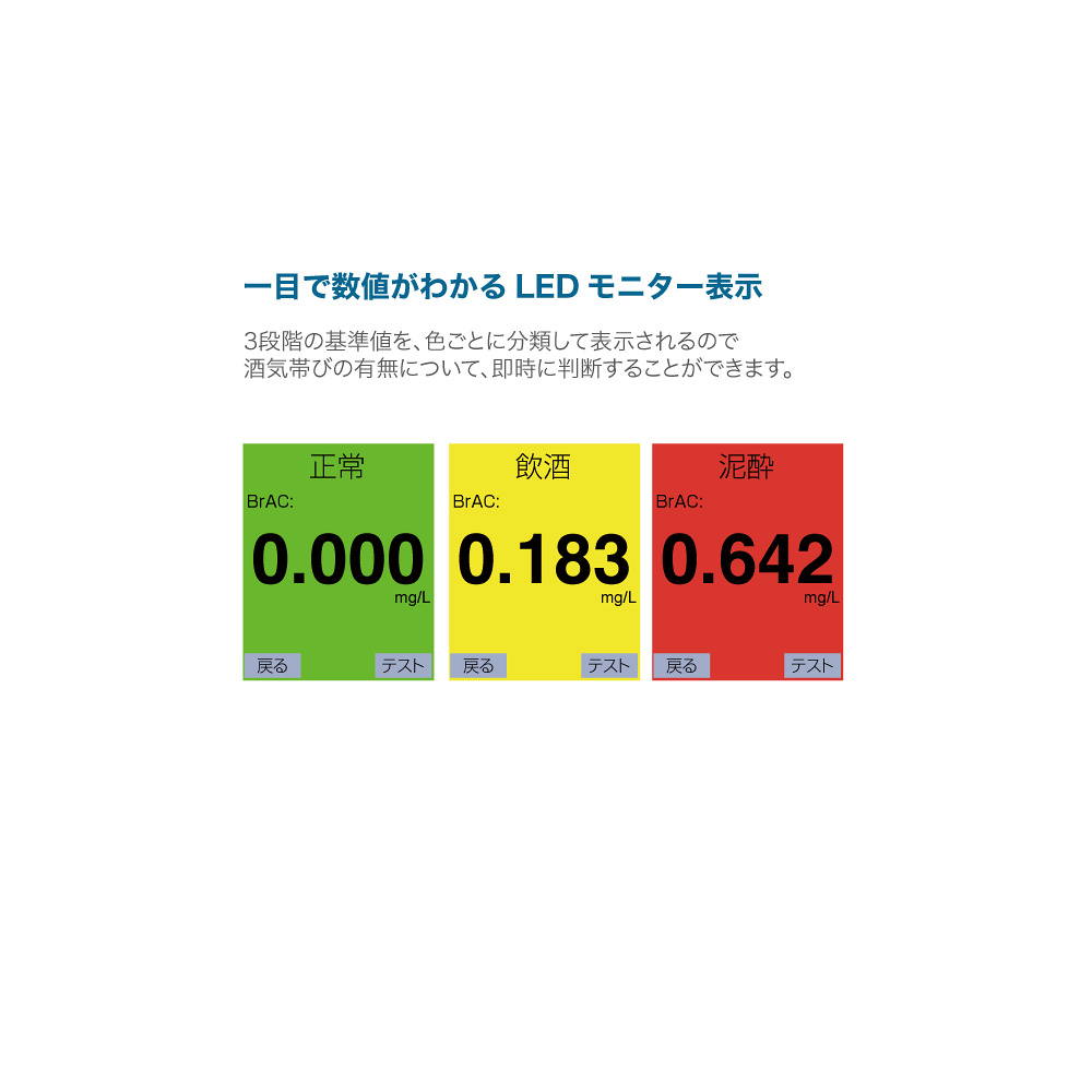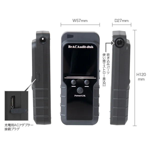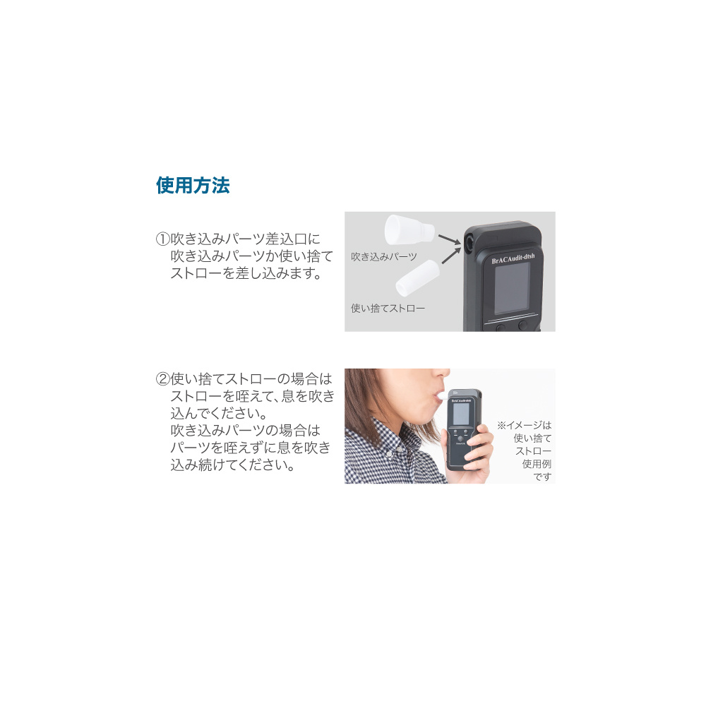 - 息を吹き込むだけで簡単にアルコール濃度を測定することができます。