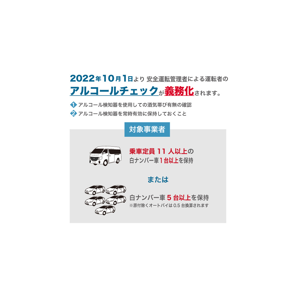 - ■2022年10月1日より安全運転管理者による運転者のアルコールチェック義務化により下記項目の実施が必要です。