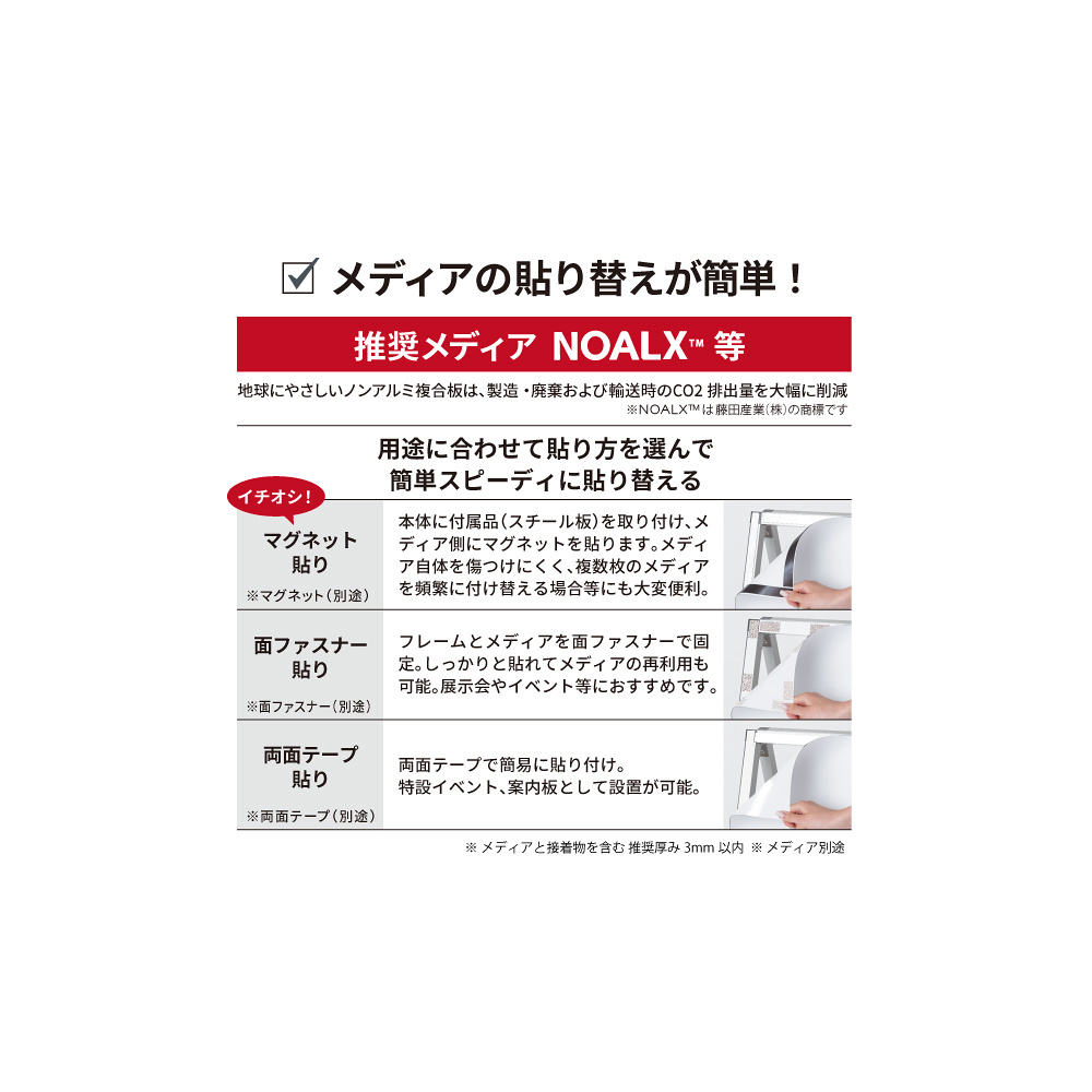 - メディアの貼り替え簡単 → 好みの貼り方で、簡単・スピーディに。