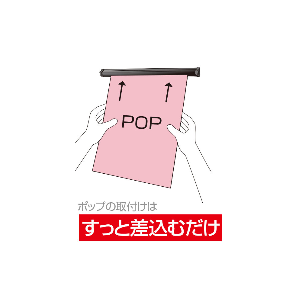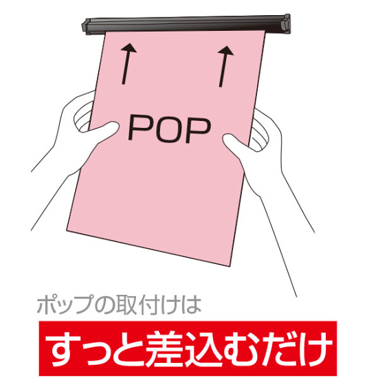 - ポスターやPOP用紙を下からスッと差し込むだけ。取り外しもワンタッチ。
