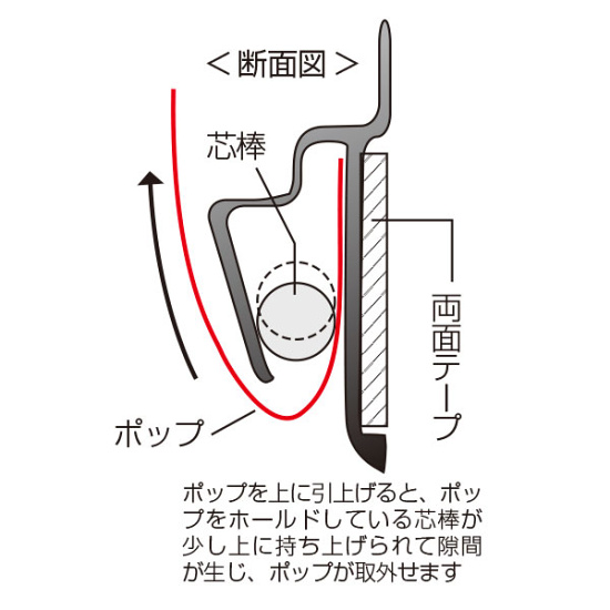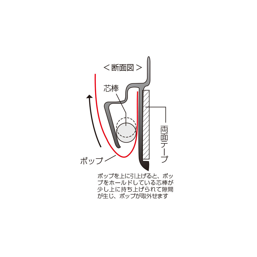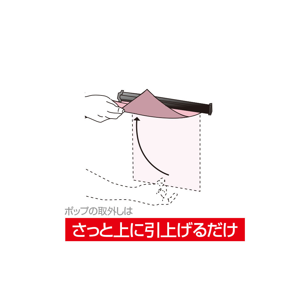 ラックの中に収納された芯棒でPOPを挟む為、簡単に設置・取り外しが可能。