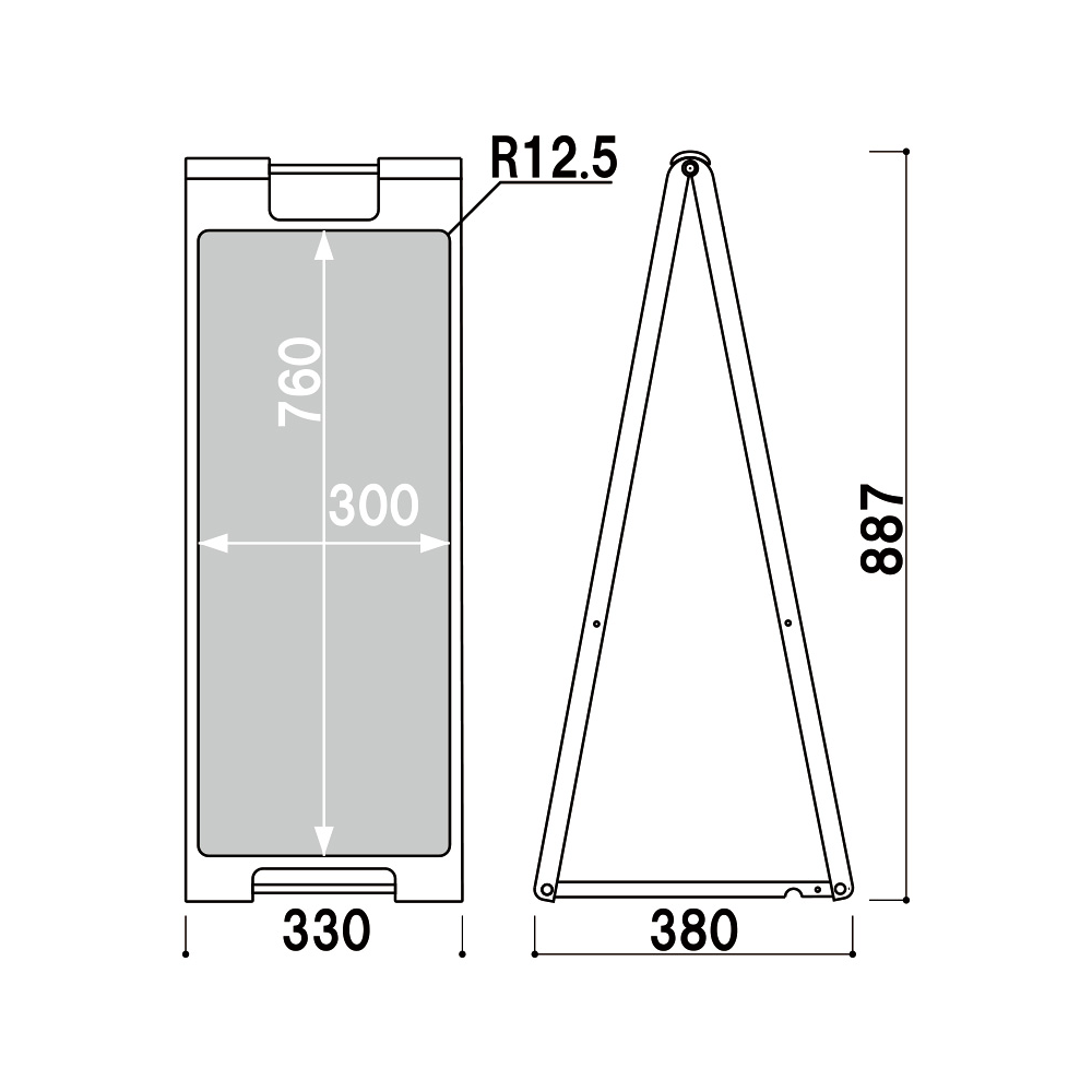 - スタンドプレートは幅33cm×高さ約90cm(H887mm)に対し、表示面が幅30cm×高さ76cmと看板本体がそのまま表示面になっているかのようにスリムな形状ながらムダなくデザイン面を有効に表示させることができます。