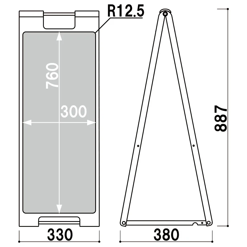 - スタンドプレートは幅33cm×高さ約90cm(H887mm)に対し、表示面が幅30cm×高さ76cmと看板本体がそのまま表示面になっているかのようにスリムな形状ながらムダなくデザイン面を有効に表示させることができます。