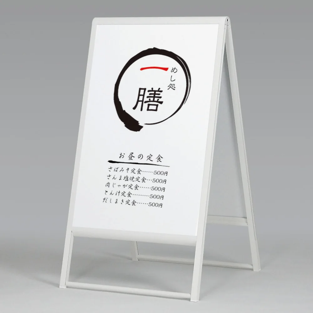 スタンド看板 アルモード 240 屋外用 両面 ホワイト W600×H900のこちらの看板のシート印刷・貼込製作も承ります。