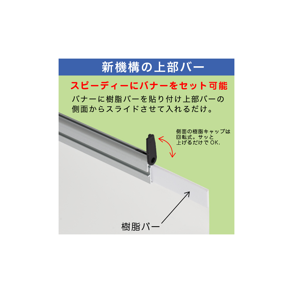 - 従来のバナースタンドはバナーを一度セットするとスタンド本体から取外ししにくいものが多かったのですが、ロックアンドロールバナースタンドはバナーを簡単に本体から取付け・取外しできる画期的構造なのでイベントごとに違うバナーを掲示できます。