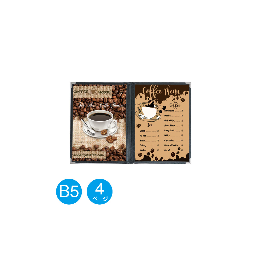 ローコストで大好評のクイックメニュー。カフエ・レストランなど様々な場所でお使いいただいております。 中紙の出し入れが簡単なクリアタイプです。