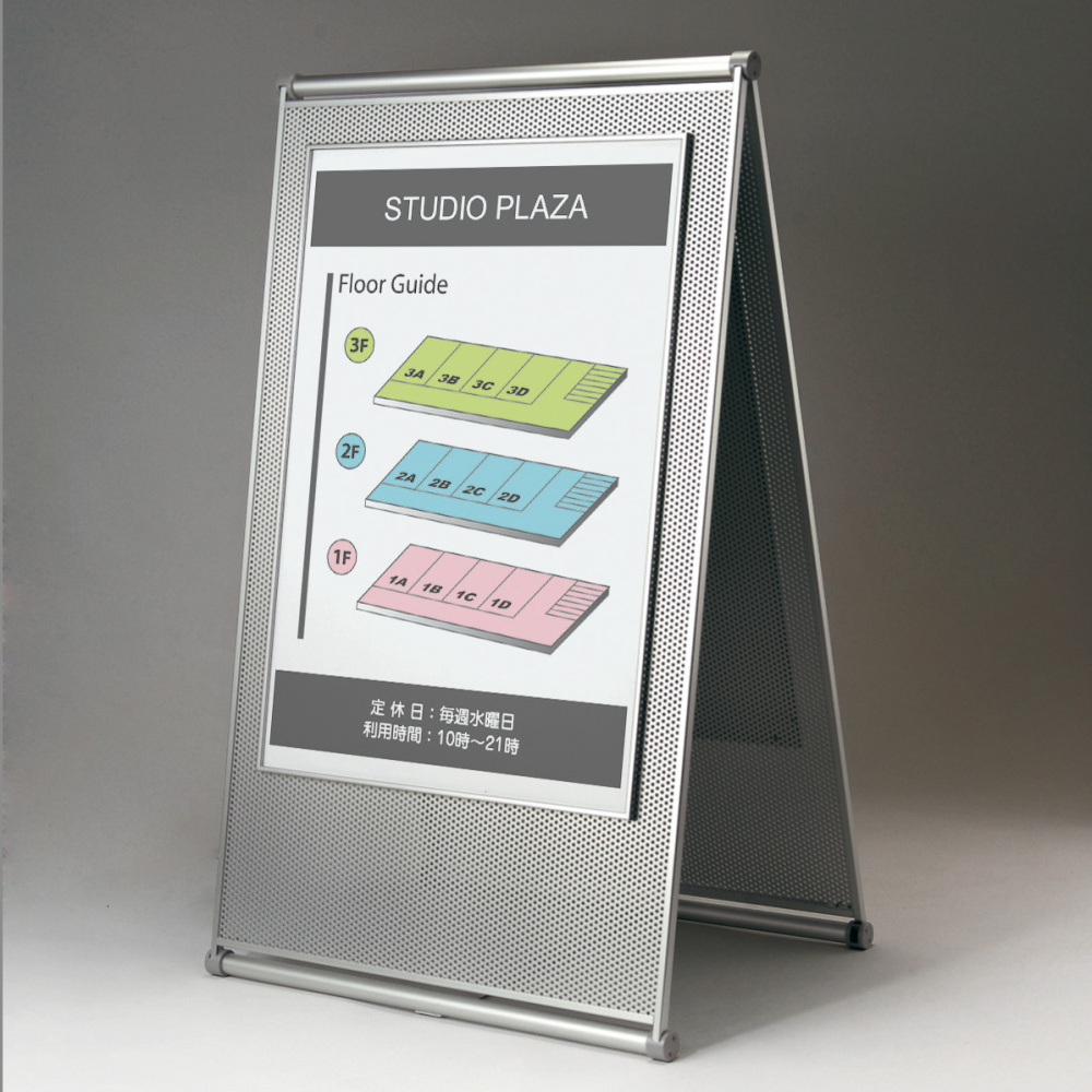 安定感のあるA型両面ポスタースタンド。商業・公共空間をモダンに演出します。 -