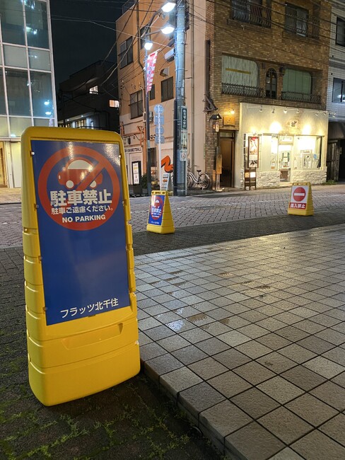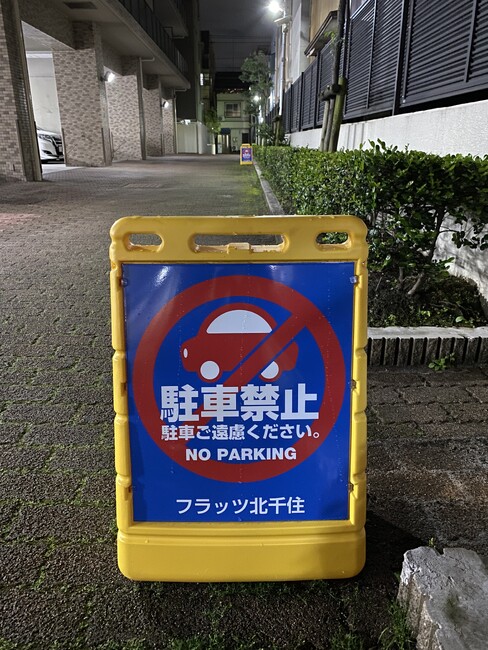 「駐車禁止」と「進入禁止」を裏表に表示し、通路の入口近辺方向からは「進入禁止」が見えるように、マンション管理組合の理事が全員で手分けして水を入れて配置しました。表示が見やすくていいです。あとは風にどれぐらい耐えられるか、どのくらいで汚れるのか、耐久性がどのくらいあるのかが気になります。