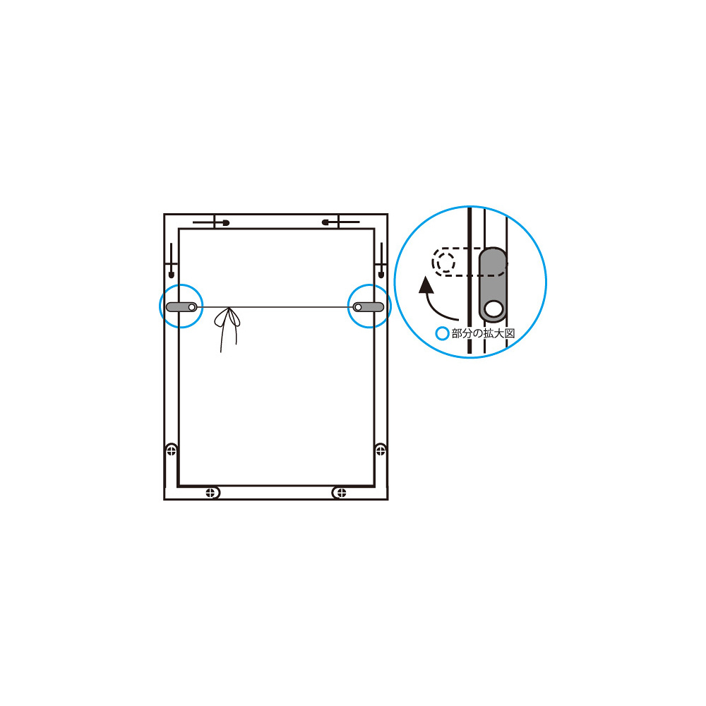 ■吊り金具・・・吊り下げ金具はフレームと平行に溝へはめ込み、右図のように矢印の方向へ押し上げ固定します。つり下げ金具の穴にひもを通して完成です。