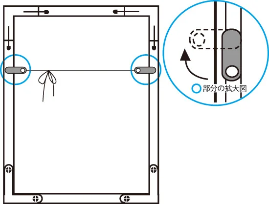 - ■吊り金具・・・吊り下げ金具はフレームと平行に溝へはめ込み、右図のように矢印の方向へ押し上げ固定します。つり下げ金具の穴にひもを通して完成です。