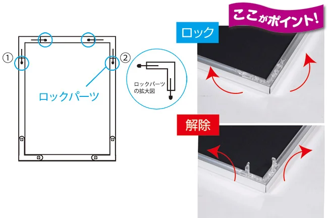 - ■開閉の仕方・・・ロック解除した辺をスライドさせてフレームを開けます。