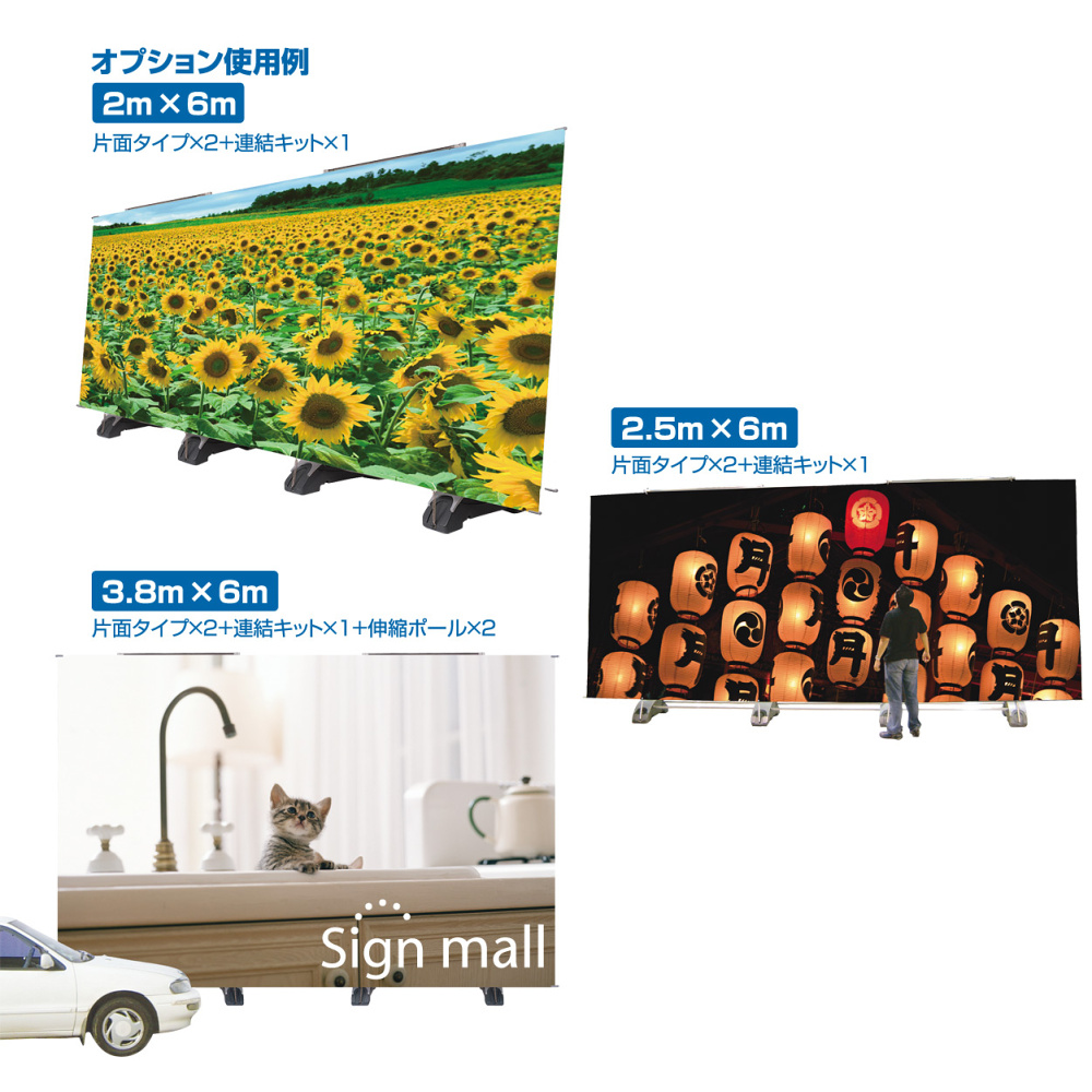 - 連結する際は幅2000mmでは連結ができませんので、2台共3000mmで連結する必要がございます。その為,5000mmのバナーは取り付けできません。6000,9000,12000・・・と3000mm刻みでの連結であれば制限なく延長可能です。