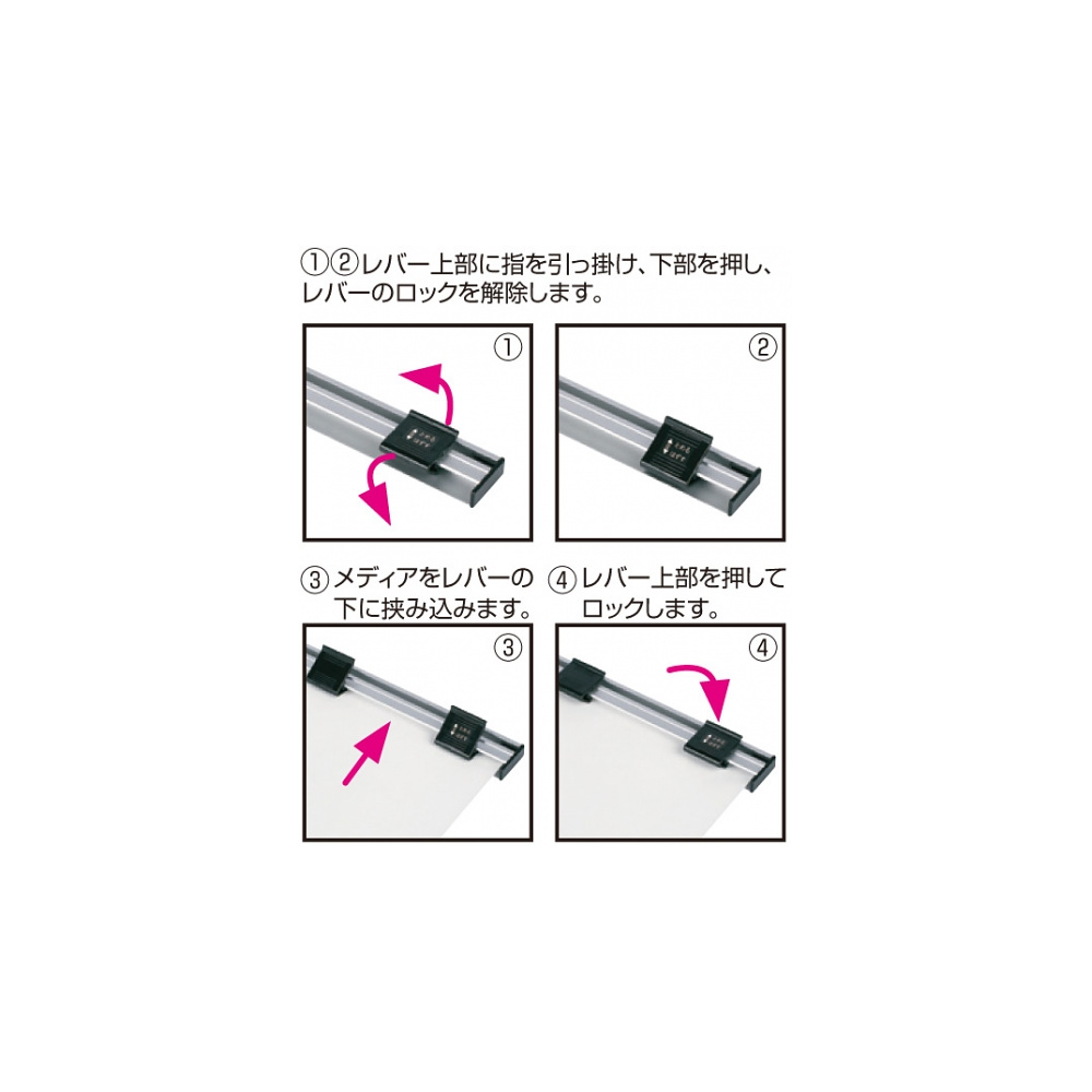 - バナーを上下のバーに差し込んでロックするだけで簡単にバナーにメディアを取り付けることができます。