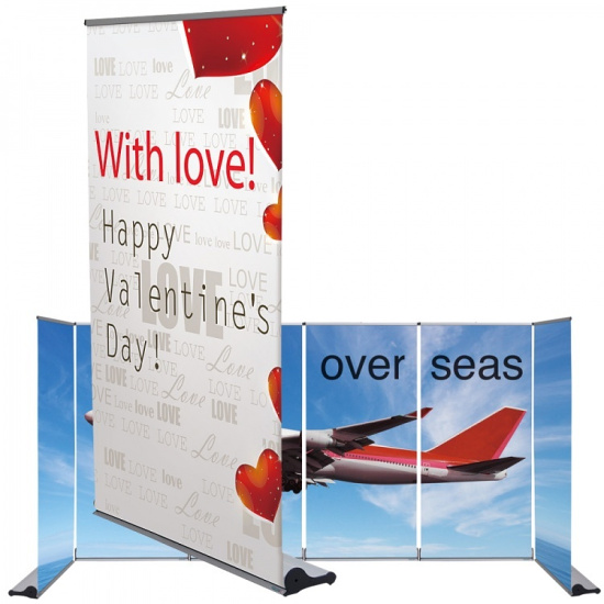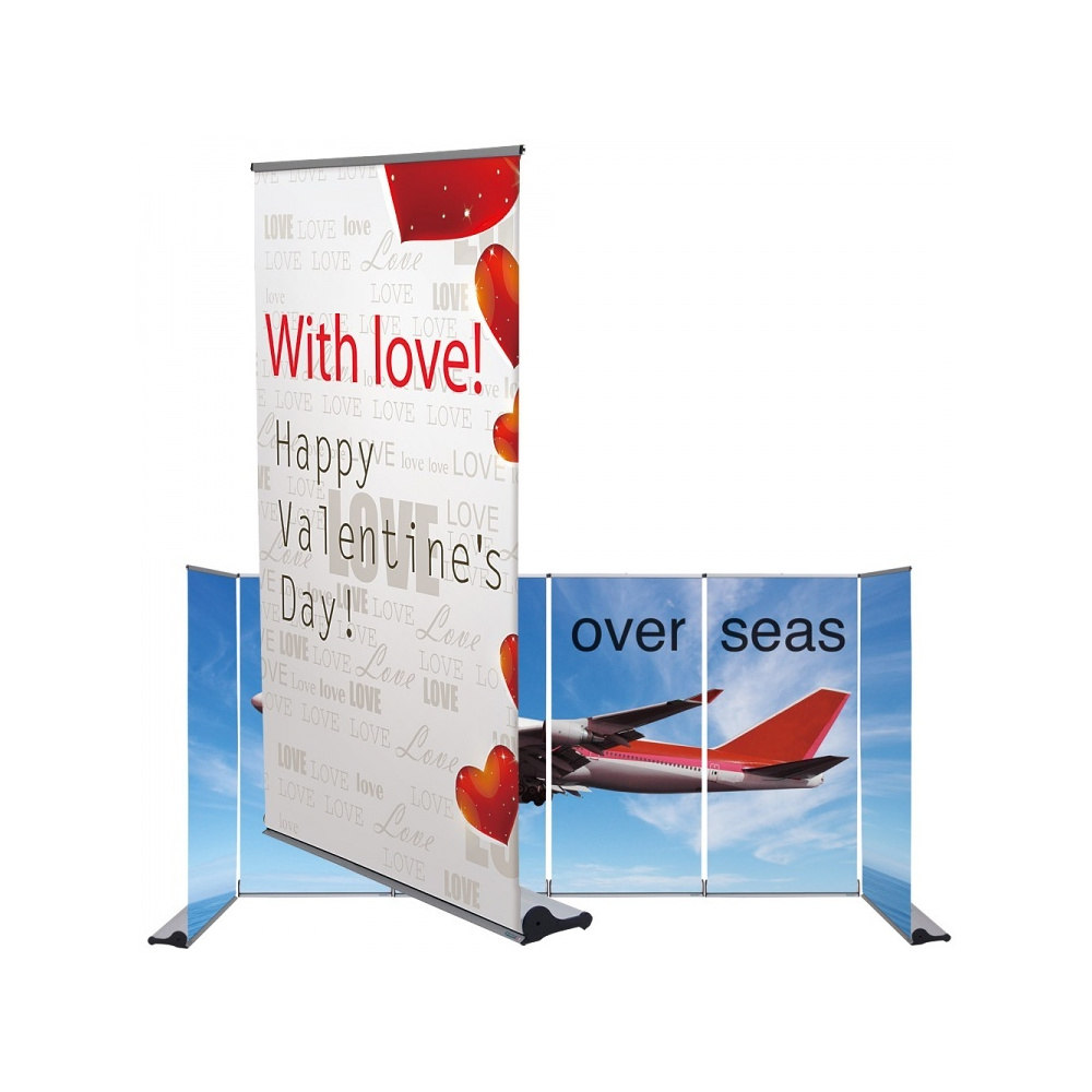 また、1台の単体使用でもロールアップの巻取り式ですぐに展示しコンパクトに収納することができます。連結も可能で高さも変更可能な優れものです。
