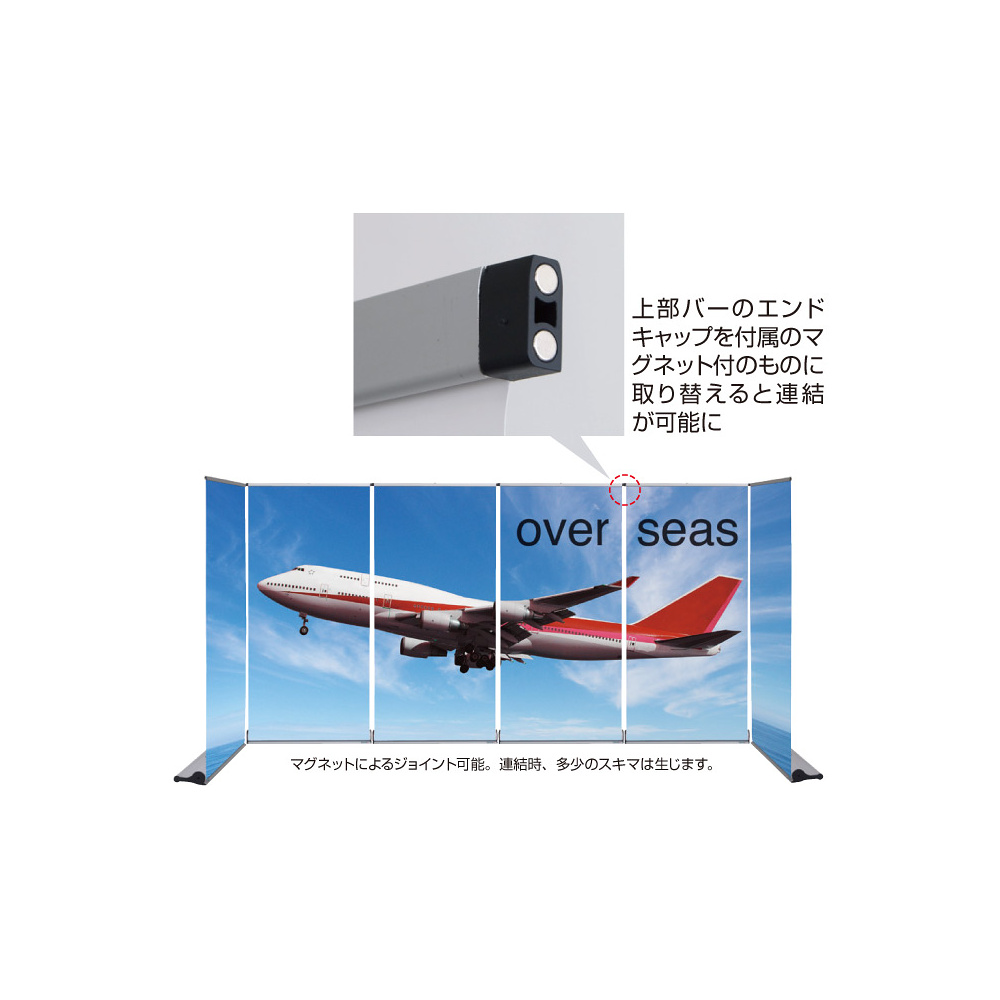 - マグジョイントロールバナーは上部バーのサイドにネオジム磁石が内蔵されているので、バナーを横に連結させて大型広告のように掲示ができます。