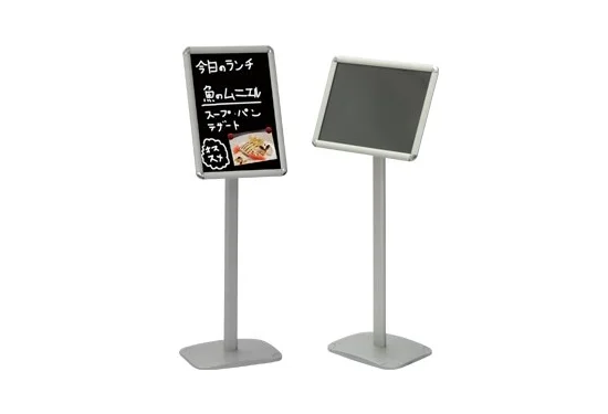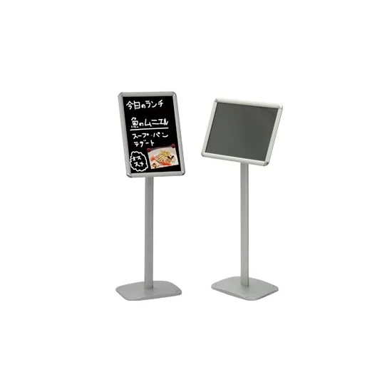 ボード部分はブラックボード用マーカーで書き消しでき、マグネットの使用も可能。透明板付でポスターグリップとしても使えます。