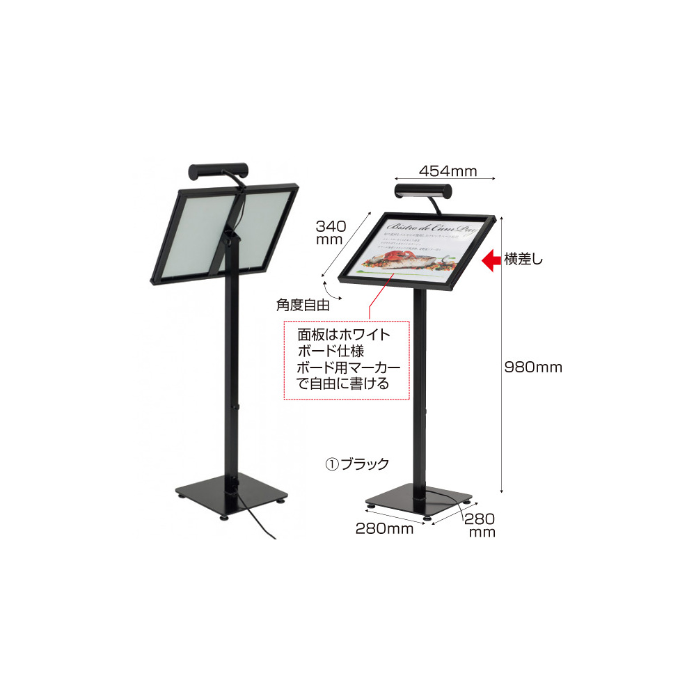 - LED付きで広告面を明るく照らす、夜間でも安心のLED付メニュースタンドです!